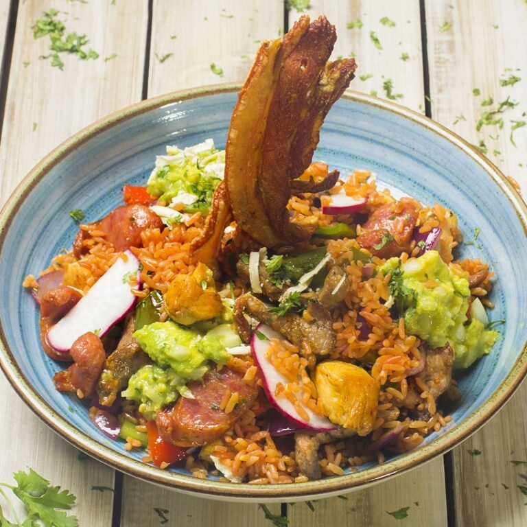 Lomo viche a la parrilla sobre arroz mexicano, cebolla, pimentón, salsa ranchera roja, salsa ranchera verde, tajín, queso fresco, pico de gallo, totopos aguacate y cilantro.