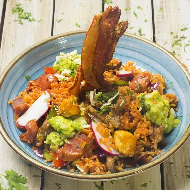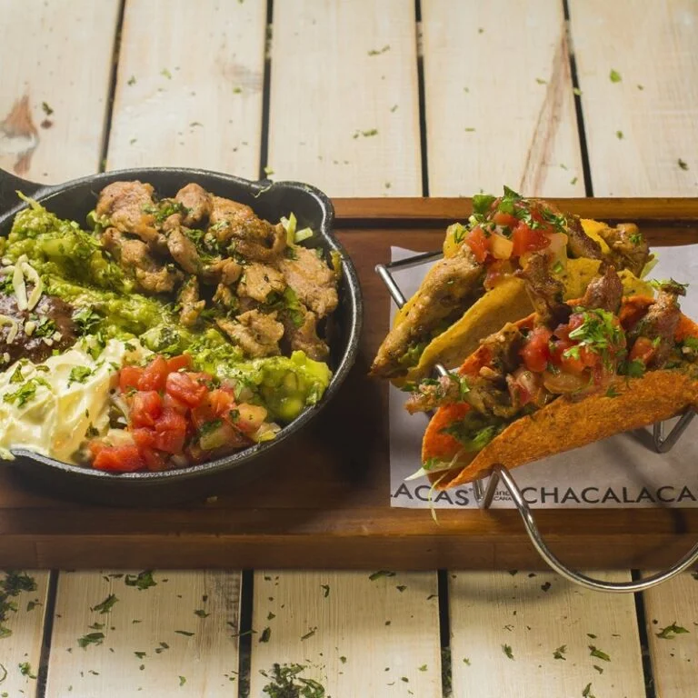Pollo y res deshebrados, refrito de frijol, guacamole, queso fresco, lechuga batavia, sour cream y pico de gallo. Acompañados de tortilla de maíz. (Sugerido para 3 – 4 personas)